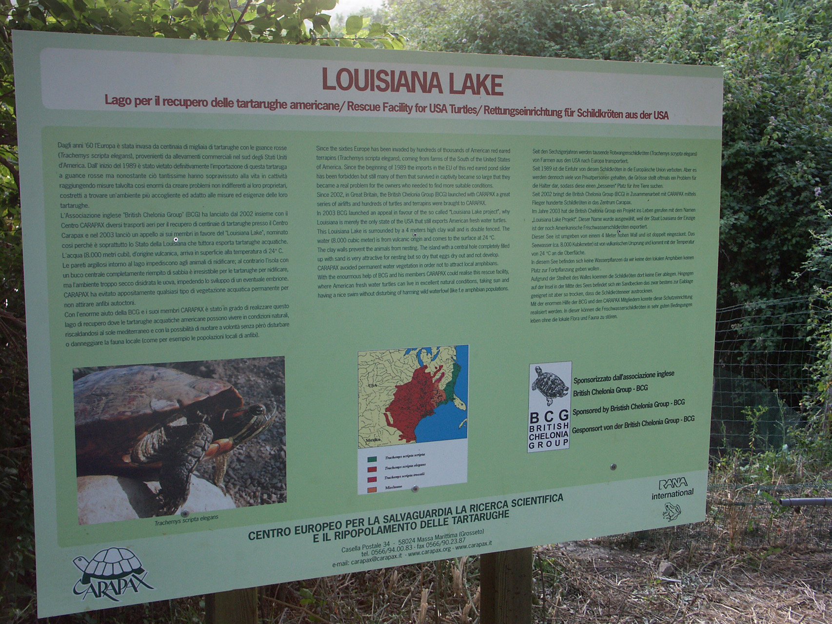In 2007 the British Chelonia Group and RANA inaugurated the rescue facility for unwanted USA Red eared pond terrapins in Italy. Some 3500 unwanted terrapins were rescued and readapted to living in the wild, awaiting their repatriation to the USA.